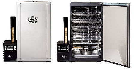 | The new 4-rack Digital Smoker includes all the features of the Original Bradley Smoker, along with the benefits of digital technology. Temperature, time, and smoke are now completely controllable so you can decide how much smoke you want, how long your food is going to be smoked for, and at what temperature. Perfect for entertaining, creating gourmet foods in your own home, or just enjoying the flavor that smoking brings, the new Bradley Digital Smokers offer an easier and better way to automatically roast, smoke and barbecue in the outdoors. Specifications: Product Code BTDS76P Finished Box Weight: 42.5 lbs Finished Box Dimensions: 34" H x 20" W x 18" D Construction - Exterior : Powder Epoxy Steel, Interior: Aluminum Internal Cooking Vol : 2288 cu in Internal Heater: 500 watt cooking element / 125 watt smoking element Power: - 120 V 50 - 60 Hz , - 5.5 Amps (240 Volt Model TBA) ETL & CE Listed Max Temperature: Controllable up to 320F Min Temp: subject to ambient Digital Controls : Temperature, Time, Smoke Adjustable racks: 4 Warranty: 12 months User Guide Recipe Booklet Comes with Rectangular Tray & Drip Bowl Bisquettes not included
