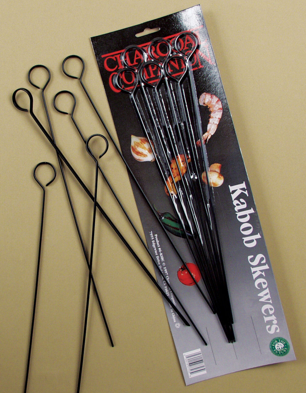 This set of Chrome Kabob Skewers come as a set of 6 single skewers. They may be used individually or with our Kabob Rack and Skewer Set manufactured by Charcoal Companion. These skewers are 12 inches long, not including the curved handle and come in a black, non-stick finish.