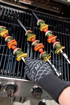 Our new "Pit Mitt" BBQ Glove is Aramid heat resistant glove. What does that mean? Aramid fibers are a heat-resistant and strong synthetic fibers. They are used in aerospace and military applications, for ballistic rated body armor fabric and ballistic composites, in bicycle tires, and as an asbestos substitute. They are fibers in which the chain molecules are highly oriented along the fiber axis, so the strength of the chemical bond can be exploited. Maybe more than you wanted to know, but just know these guys are STRONG! Forms a barrier preventing heat from entering the inner layer for ultimate protection Handle hot objects on the grill Reversible to fit both left and right hands Long length protects lower arm Soft cotton interior Never burn your hands again when handling hot objects on the grill. The Pit Mitt withstands temperatures of up to 425-degrees. Pit Mitt is has silicone on the surface for superior grip. Designed for the Grill - Great for the oven too! And, they are washable. Contains 1 Pit Mit |