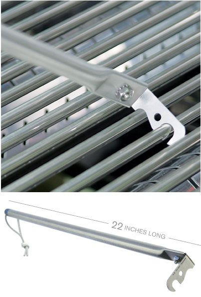 | Like dental floss, Grillfloss cleans where your brushes can't, the underside of the grill grates. With a simple push, turn and pull, Grillfloss wraps around each grill rod cutting through the toughest caked on grill gunk. It was designed to work on round grill grates. Although the sizes of grill rods vary from one manufacture to the next, the industry has figured out that 5/16 inch and 3/8 inch diameters are the way to go for maximum grilling performance. With that in mind, we have the two sizes built into our Dual-Sized Cleaning Head which ships standard with every grillfloss. All in all, if your grill rods are round and roughly the thickness of a standard wooden pencil. Some Weber grills come with perfectly round grill rods while others are shipped with an upside-down 'u' shaped variety. grillfloss will only work on those Weber models with perfectly round grill grates. The cleaning head of the grillfloss has two different size openings built into the same blade. The grillfloss ships ready for use with the "L" size opening while the larger "XL" cleaning head is tucked away in the tube portion of the tool. To change the cleaning head, simply remove the cleaning head from the tool with a philips head screwdiver, and fasten back into place with the desired size opening exposed. The grillfloss is comprised of 301 and 304 grade stainless steel, the same stuff they use for the roof of the Empire State Building! You'll love this tool for the cleanest grill around. Size: 22" long. - dishwasher safe. |