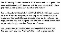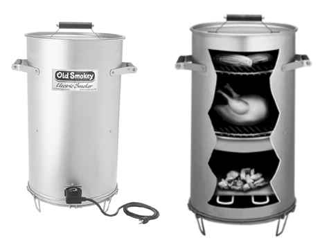 | For over 75 years, this company has been producing the oldest and most famous names in outdoor smokers. In fact, not even one single nut has been changed! There are loyal Old Smokey fans all over the world. The Old Smokey brand is a backyard staple in Texas and the surrounding states. It should be everywhere. Now, they offer an electric model for those folks seeking convenience in barbecuing, carefree cooking or, due to regulations, cannot have the charcoal variety. (I know one of the managers at Old Smoky who only uses the electric model!) The Old Smokey® Electric Smoker (also known as the "Redi-Smok") is a totally unique approach to cooking. It’s electric! It has a sealed lid to keep the juices in, which means there’s no need to add any water to keep the meat moist and flavorful. The flat top design provides constant even basting. It has two cooking racks and an adjustable heat control for added versatility. It’s electric and practically foolproof. It'll work for hamburgers, but its better for roasts, turkeys, briskets, fish and vegetables. Near the bottom is a 1250W heating element that gets to about 400ºF (200ºC) with the variable heat control set on "high." You can adjust it down to whatever temperature you want by turning the heat control. Smoker Dimension: 29" tall x 15.5" diameter. This item is only available via UPS in the lower 48 states. Due to the size/weight, it is not available other than by ground delivery. Should you need other delivery arrangements, please contact us directly for any additional shipping costs. |