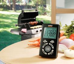 The Maverick Remote Rotisserie Thermometer makes it possible for you to monitor the progress of your food from up to 100 feet away. The unique transmitter clamps to the rotisserie handle and turns with it during cooking, measuring the temperature and sending information to the receiver which displays it in either F or C. The thermometer features four meat pre-sets and four doneness levels to choose from, or you can set your own specific doneness temperature. The receiver shows both the actual temperature and the desired temperature, and beeps when the set temperature is reached. The thermometer also features a timer that counts up or down, and comes with 2 different thumb screw collars and 4 different pairs of probe clips to fit most spits. 3 AAA batteries are included.
