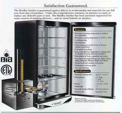 The Bradley Smoker is a 110-volt electric smoker for those low-temperature cooking environments. It is perfect for west coast seafood delicacies as well as traditional barbecue meals such as beef brisket, pork shoulders or ribs. It is great for chicken, seafood, sausage, or anything not needing direct high temperatures. Depending on the outdoor ambient temperature, it can be used continuous barbecuing, hot or cold smoking. While smokers must be tended constantly, the Bradley Smoker automatically produces clean, cool smoke for up to 8 hours safely and without supervision. The Bradley Smoker makes clean tasting food, without any aftertaste.