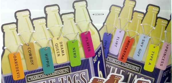 This unique set consists of 14 different tags for all of your friends. Use 'em on coke, beer or other drink bottles so everyone can keep tabs on their drinks. If you have more than 14 friends, order two sets! These tags are both sturdy and reuseable. The 14 tags consist of the following tag phrases: Daredevil, Cowboy, Hippie, Drama Queen, Nerd, Player, Jock, Flirt, Rockstar, Shy Guy, Type A and Princess.