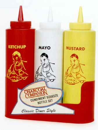 This Condiment Bottle Set means no more transporting of glass containers that might be broken. This nostalgic set travels well to outdoor gatherings and is perfect for for gift baskets. The set comes complete with Ketchup, Mayo and Mustard bottles. Each bottle is plastic and holds 16 ounces. The classic diner style bottles have twist off caps. Condiments not included!