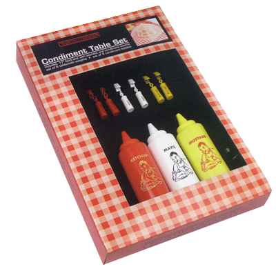This Condiment Table Set is all you will need for those impromptu outdoor entertaining events. The set includes, plastic mustard, mayo and ketchup condiment squeeze bottles which are durable, as well as, a fun nostalgic touch to casual dining. Also included in the set is a seventeen inch food tent with pockets and condiment art to fill the pockets. This handy lightweight tent protects your food from those pesky summertime bugs. It is large enough to cover serving platters, with room to spare. Lastly, there are six tablecloth weights to ensure that your dining does not get ruined by a little wind. Time to party!