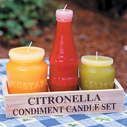 Keep Mosquitoes Away! They work on mosquitoes so you don't have to. These Citronella candles in wooden crate, (ketchup, mustard, relish) emit a subtle fragrance that’s pleasing to humans, but completely offensive to mosquitoes and other flying insects. These citronella wax candles are safe, effective and will amaze your friends with their beauty. These candles come in their crate! Citronella is a natural insect repellent.
