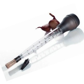 This updated and upgraded dripless baster set is a great roasting accessory. The set includes a baster made of clear polycarbonate and heat resistant silicone, a removable silicone time, and a natural bristle brush. The body of the baster features easy to read measurements and a ridge at the end to keep the baster level when not in use.