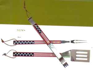These patriotic tool will compliment any backyard event. Not only attractive and supportive of the USA, they are designed for a long life. The long reach handles will keep your hands and fingers from being seinged while at the same time allowing you to control the food easily and efficiently. The handy leather straps allow you to hang them for easy access. Easy to clean and store, these barbecue tools will show how proud you are!