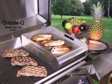 The Griddle-Q is a stainless steel cooking surface that fits easily and securely over your outdoor barbecue grill, providing you with a whole new world of outdoor cooking possibilities. With the new Half Griddle, you can grill on one side and griddle on the other side. If you have a gas barbecue grill, you can use the Griddle-Q™ to open up a whole new world of cooking possibilities! Each Griddle-Q™ Features: high quality solid stainless steel cookware--the best that money can buy. Unlike some steel cookware, the Griddle-Q™ will not rust, chip, crack, fade or peel. It will always shine up no matter how old it gets--Guaranteed. A formed basin along the front of the grill allows for the easy catching and clean disposal of runoff liquids, such as bacon grease or cooking oils and the stainless steel cross-bracing underneath offers substantial stability.