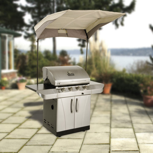 Provide elegant protection from sun and rain while grilling with the grill canopy. It is made with Gardelle™ protective fabric with flame retardant treatment. It has smoke vents and is able to adjust height to fit different grills. Clean up is simple just wipe it off. It comes with a three year warranty, installs in minutes without tools and it clamps to the back of the side platforms.