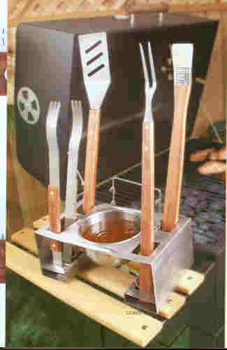 Our Grillside Barbecue Tool Caddy offers a great way to store those tools you use frequently around the grill or barbecue pit. Made from durable, rust resistant and dishwasher safe stainless steel, this unique device is perfect for those areas with limited surface space because of its small "footprint". The one quart sauce bowl conveniently placed in the middle for easy access and balance. This is the perfect tool for the professional backyard chef!Now you and be organized and neat!