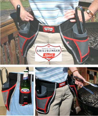 The Original Grillslinger does just that. It's a cleverly designed twist on the classic builder's belt. A barbecue tool system, it includes three precision grilling implements: tongs, flipper and grill knife, securely held by washable 'lock-and-load' inserts.