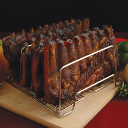 Our new Platinum Rib Rack is perfect for those limited spaces on your barbecue pit. Here is a great device to free up that precious space when cooking for family, friends or just wanting to stock up the frig with those spicy ribs for the rainy days! This rib rack holds up to 4 racks of ribs at one time. Cut the racks in half or cook 'em whole, it does not matter with this wonderful equipment. The rack is constructed from stainless steel and is dishwasher safe. Just run it through the dishwasher.
