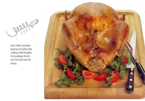 If you have tried "tying up" your bird after stuffing it, then you will appreciate this handy little tool. Made from ever lasting stainless steel, this jewel will hold the skin together easily. Simply hold the skin together as you pierce it with the lacer. Turn clockwise as you continue to pinch the skin together. Continue turning until the opening is closed and everything is snuggled up nicely. Cook the turkey or chicken with the lacer in place. When the bird is finished, remove the lacer by turning in a counter-clockwise direction. Dishwasher safe! SIZE: 4 3/4 inches long and 1 1/2 inches wide at the base.