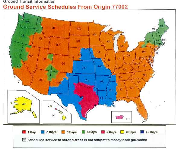 ESTIMATED DELIVERY TIMES: This Time Chart offers an estimate of how many days it takes to get a package from our location to you in business days via FedEx Ground. Color coded maps are for illustration purposes only. Actual transit times may vary. Transit times shown are in business days. For specific transit times, please use the FedEx transit time calculator. We do not ship to locations in Canada.