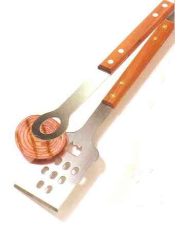 This great looking rosewood handled spatula with "tong" qualities allows you to turn anything over the grill without it slipping out of control. The round opposing tong will hold the meat and allow you full control while the fire rages on. No more losing the meat to the fire and ashes. It is made from stainless steel with brass rivets for long life and is 19 inches in length. Great for keeping the hands out of the fire! And the hinge is bent metal for long life. No rusty hinges.