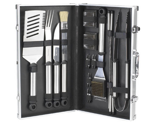 Sleek and sophisticated, the 20pc Stainless Steel Master Grill Set comes in a striking aluminum carrying case that securely holds each tool in place. Featuring stainless steel tools with brushed stainless steel handles, it is the ultimate gift for any grill master.