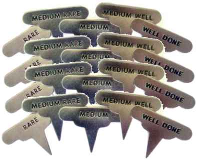 These Stainless Steel Meat Markers are designed with your guests in mind! Each attractive set comes with 5 markers - Rare - Medium Rare - Medium - Medium Well - and - Well Done. One marker each for each type of doneness. Let your friends and neighbors know their meat has been cooked to their heart's desire. Quantity purchase of 4 sets of Meat Markers - total of 20 markers!