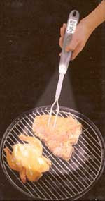 The new Taste - Temp Fork has a lighted digital temperature readout that allows for ease of use and at night! With this fork, you can measure the temperature of the meat thus controlling food-borne bacteria and assure your own doneness. It also has a handy lighted display for nighttime use. The fork beeps and an LCD screen flashes when the selected temperature is reached. To save batteries, it even has an automatic shut-off. Easy to use, great to own.