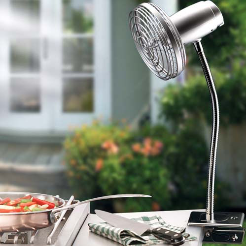 | This handy portable fan is 6†diameter and uses 4 AA batteries (all included) to provide breezes and cooling air anywhere. Aim the fan over the grill and blow the smoke away! Energy efficient, typical battery life 4-5 hours continuous, a whole summer with intermittent on/off operation. Clip onto any shelf up to 1†thick and bend the gooseneck to the desired angle. Stainless Steel housing and mounting clip, useable rain or shine. |