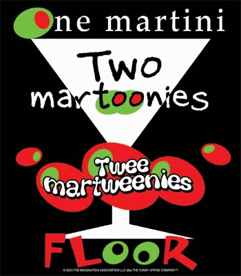 | Do you know one of those guys who just doesn't know when to stop. He just keeps going starting with one martini then two martoonies, next comes twee martweenies then FLOOR! Each apron is generously cut, full length (28"W x 33"L) bib apron is a durable (7 oz.), machine washable 65/35 poly-cotton twill. |