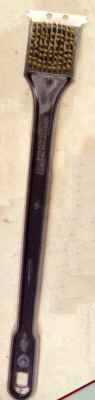 This 18 inch brush, made from heavy duty flexible plastic, protects your hands from the hot coals of the fire and prevents burns. The long handle offers the ability to place leverage on the grilling surface for thorough cleaning. These brass bristles are made for easy cleaning and will remove baked on grease fom the grill's surface. Attached is a metal scraper with special notches which fit any grill size. Be safe and clean with the long handled barbecue grill cleaning brush.