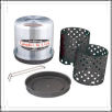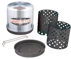 This Campfire in a can is great for camping, backyard, beach and RV. It consits of a lightweight aluminum canister top, a 2 piece black porcelain coated burning cage, a porcelain coated steel base, and a steel lifting tool. Also available are the steel stand and stainless steel BBQ grill (sold separately).