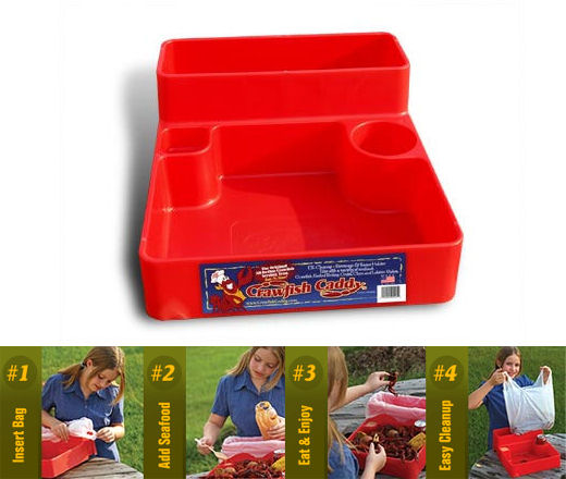 The Crawfish Caddy™ holds up to 5 lbs. of steaming hot crawfish or any of your favorite seafood - Crawfish, Boiled Shrimp, Crabs, Clams, Lobster, etc. There is a place for your beverage, dipping sauce, and a rear area that is can be lined with a plastic grocery bag that we all collect. This makes disposing of peelings a cinch!