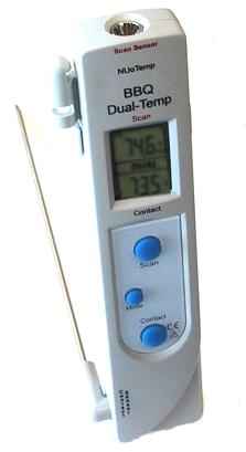 The Dual Probe BBQ Thermometer combines both infrared and probe thermometers in one unit. It is ideal, because when you use the infrared sensor, you don't poke holes in the meat, thus keeping the juices locked inside. Included with the unit are approximate conversion tables. Of course personal experiences will differ, so you should keep track and use both the probe and infrared sensor the first few times to know where your personal preferences lie.