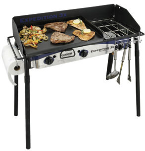 This is Camp Chef's biggest, most powerful outdoor appliance, with the added convenience of a 3-sided windscreen, adjustable removable legs and 2 side handles for easy transportation. Included with the stove is a steel seasoned griddle that covers two burners. This griddle is great for breakfast or grilling steaks. With three 30,000 BTU/hr burners, this stove is great for either the family or large crowds.