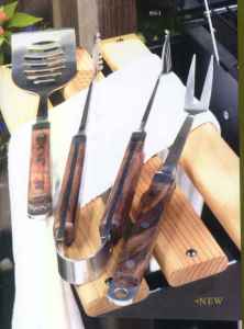 The One Piece Forged Tool Set is made from strong stainless steel with elegant, polished hardwood handles. The set includes the spatula, tong and fork all made with full tong and rivet construction. This beautiful set is not only useful but very "top shelf" in outdoor gear. These will last a lifetime.