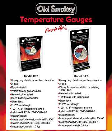 Old Smokey Chamber Thermometers Regular 2" Dial and Large 3" Dial 50 to 500 degrees When barbecuing, you need to know you are cooking at the correct temperature. Don't risk serving undercooked or overcooked foods? Replace that worn-out, broken or inaccurate factory thermometer with the Old Smokey cooking chamber thermometers. Depending upon your grill, you may simply replace the original thermometer or if a fit is not easily accomplished, drill a hole in the center of the lid and mount this accurate thermometer. | Large Scale Image |