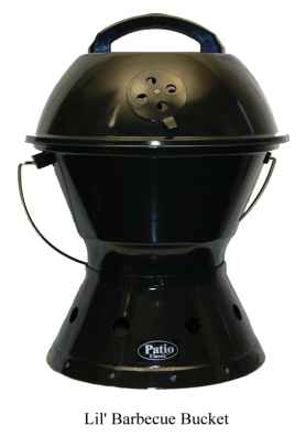 The Barbecue Bucket with a tough porcelain lid is a compact, easily transportable charcoal grill constructed of heat and rust resistant porcelain enameled steel. The Bucket offers conveniences such as an easy carry handle and a removable vented base, which also serves as a charcoal starter and ash catcher. The charcoal lights fast with a sheet of newspaper; "no" charcoal lighter fluid is required. This little bucket grill just got better by the recent addition of the porcelain vented lid. In addition, the unique design of the Barbecue Bucket is great for grilling at tailgating, picnics, and camping. Coming soon - March 2004