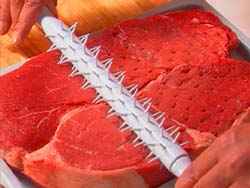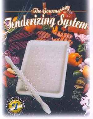 | The Gourmet Tenderizing System Make tender, savory meats to perfection The Gourmet Tenderizing System - Finally, a revolutionary tool for those who love to cook! It is easy to use and easy to clean. Simply place boneless meats on the marinade tray. The tray has small spikes to hold the meat steady while you tenderize the other site. To tenderize your meat, you gently roll the tenderizing pin across both sides of meat...the roller pin does all the work. If you are seeking more action to enhance flavor throughout meat, we suggest adding marinades and/or spices during the tenderizing process. The tenderizing pin forces the flavor effortless into the meat creating tender, savory, boneless meats. This unique product eliminates endless hours of pounding boneless meats which may cause the spread of harmful bacteria in your kitchen. The built-in pour spout also allows you to use the left over marinades for basting the meat as it grills or barbecues. This product saves you time and effort in preparation of mouth watering food. It is also convenient for cleanup time!